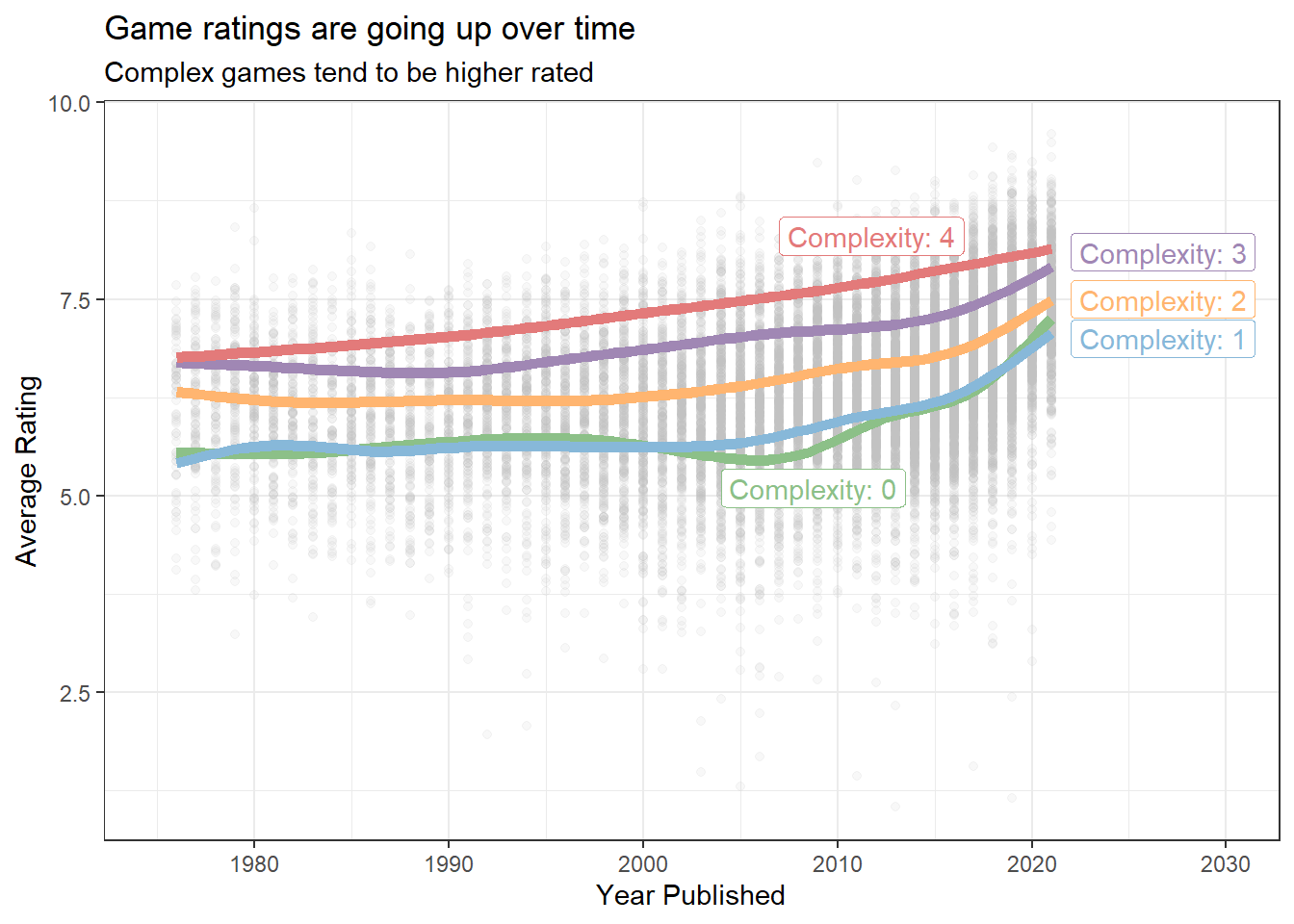 Game Ratings over time (With Complexity)